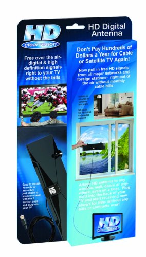 HD Clear Vision HD Digital AntennaFree over the air digital and high definition signals right to your TV without the bills.Don't pay hundreds of dollars a year for cable or satellite again. Get HD sports games, movies, shows, auto races, news reports right out of the air into oyur TV at home or office all for free.Now pull in free HD signals from all major networks and foreign stations- right out of the air without monthly cable bills.Attach HD antenna to any window, wall, doors or anywhere, even on a boat. Plug cord into the back of your TV and start receiving new shows for free- without any bills or contracts ever!Easy to install- no tools or assembly- just attach to window or wall with the 2 suction cups and plug into your TV. Includes 10 ft coaxial cable with standard connector.Features:Installs in minutesNo toolsNo technological knowledge neededFree over the air digital and HD signals from major networks and even foreign broadcastsInnovative flat, super thin antennaReceives HD 1080P channelsMulti-directional, pull in signals from all directionsNo monthly cable bills!Includes:1 x HD Clear Vision HD Digital Antenna1 x 10ft Coaxial cable with standard connector2 x Suction cups